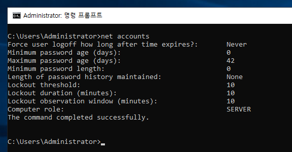 +) Administrator 계정은 계정 잠금 임계값 설정해도 잠기지 않는다.