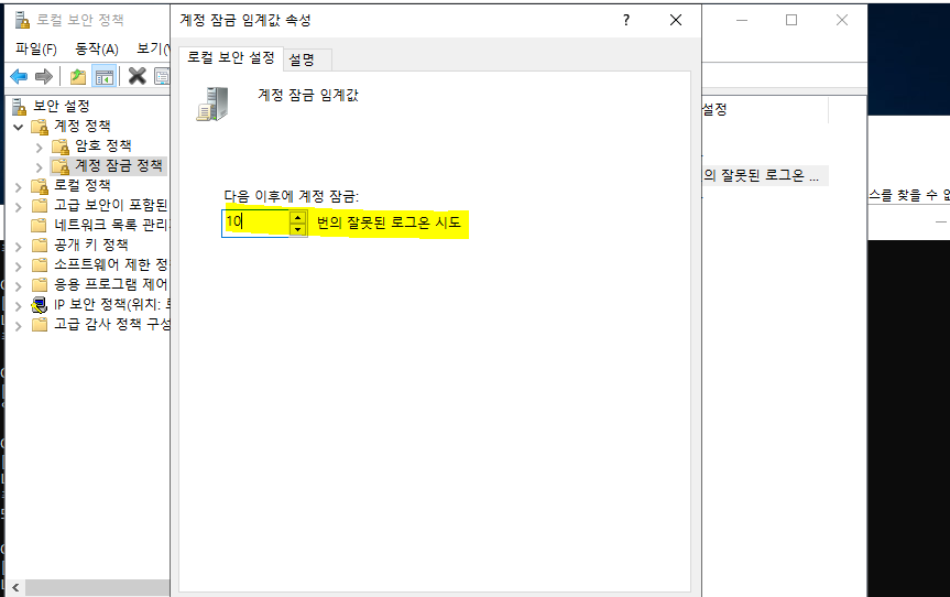 (계정 잠금 임계값 : 사용자 계정이 잠기는 로그온 실패 횟수 결정, 잠긴 계정은 관리자가 재설정하거나 해당 계정의 잠금 유지 시간이 만료되어야 사용 가능)